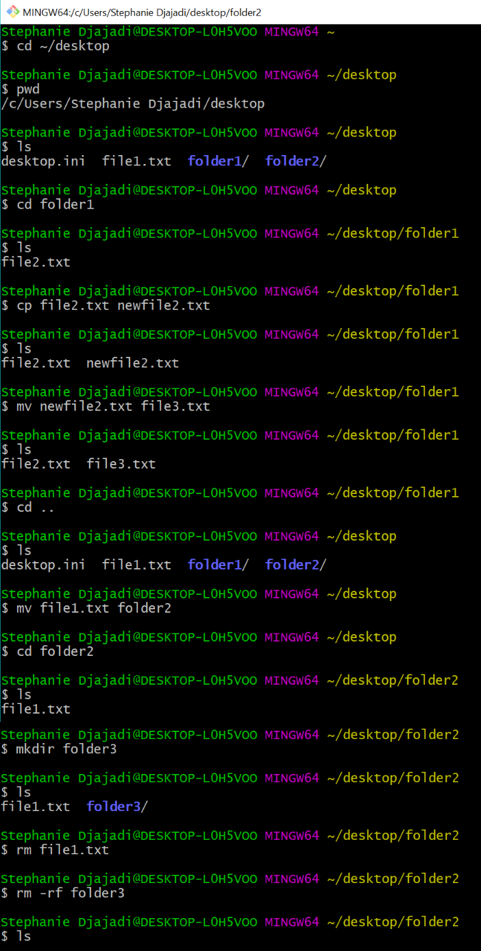 On the computer, there is a desktop with two folders, folder1 and folder2, and a file called file1. Inside folder1, we have a file called file2. Mac users can run these commands on their terminal; it is recommended that Windows users use Git Bash, not Windows PowerShell.