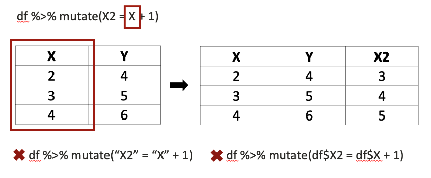However, this behavior may introduce errors when we attempt to incorporate variables from the global environment within these tidyverse pipelines. In the example shown in Figure 9.1, column_name = "X" followed by df |> mutate(X2 = column_name + 1) would yield an error, since column_name is not a column in df and the variable column_name is not defined within the environment of df