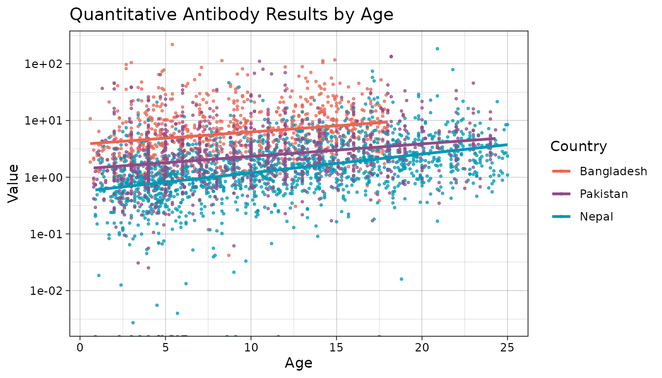 labs(title = "Quantitative Antibody Results by Age", x = "Age", y = "Value") +