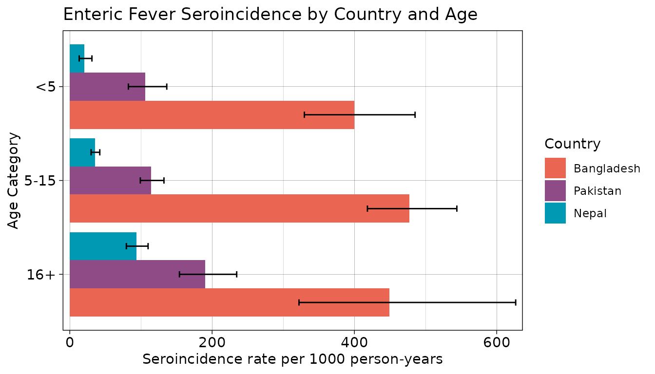 We find that Bangladesh has the highest overall seroincidence of enteric fever with a rate of 449 per 1000 person-years, as well as the highest seroincidence by age category. In comparison, Nepal has a seroincidence rate over 1 times lower than that of Bangladesh (400 per 1000 person-years) and the lowest age-specific seroincidence rates of the three countries in the study. serocalculator provides an efficient tool to conduct this analysis and produce actionable results.