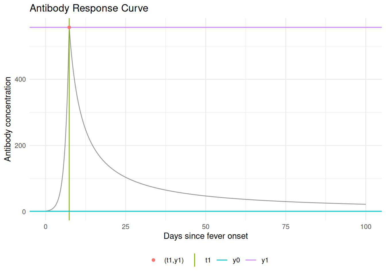 Now, we need a model for the antibody response to infection, 𝕡(Y=y|T=t)\mathbb{p}(Y=y|T=t). The current version of the serocalculator package uses a two-phase model for the shape of the seroresponse (Teunis et al. 2016).