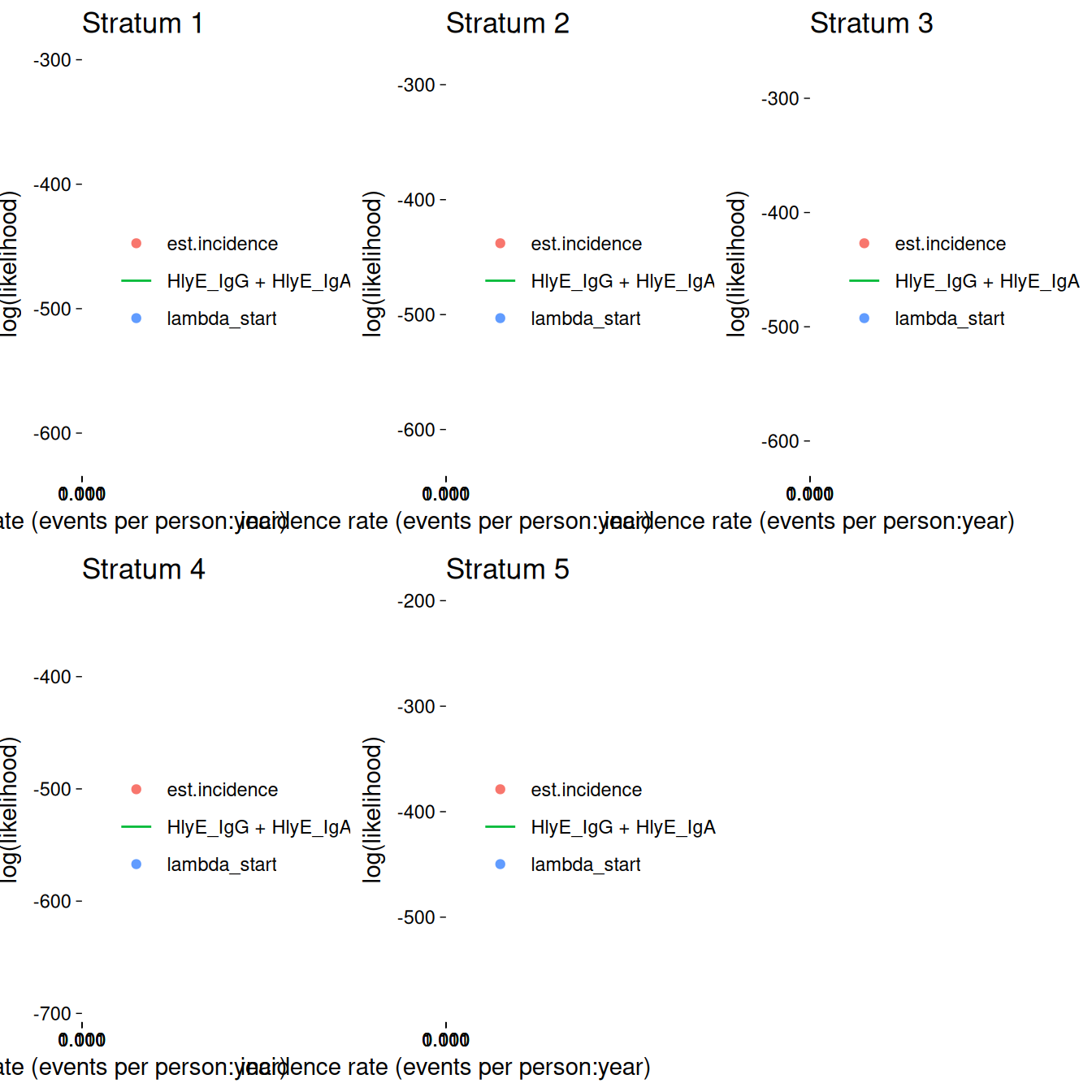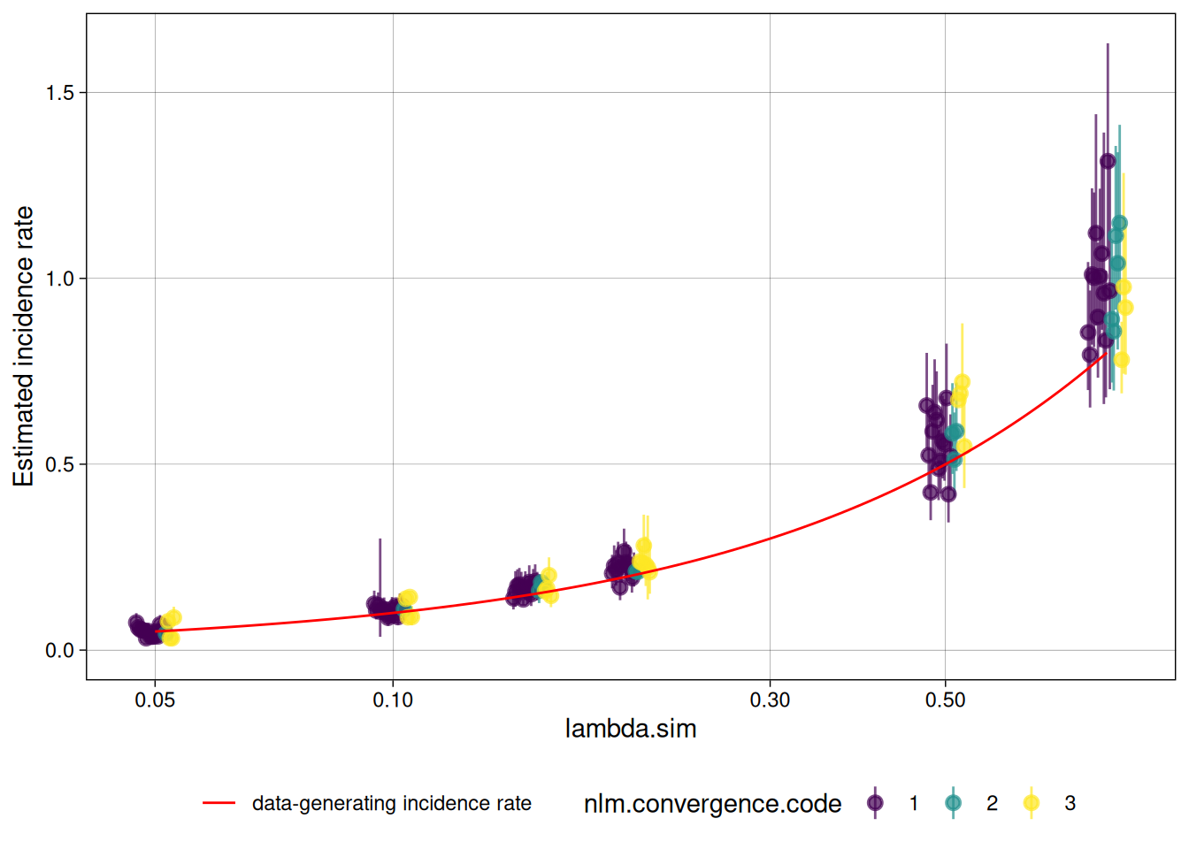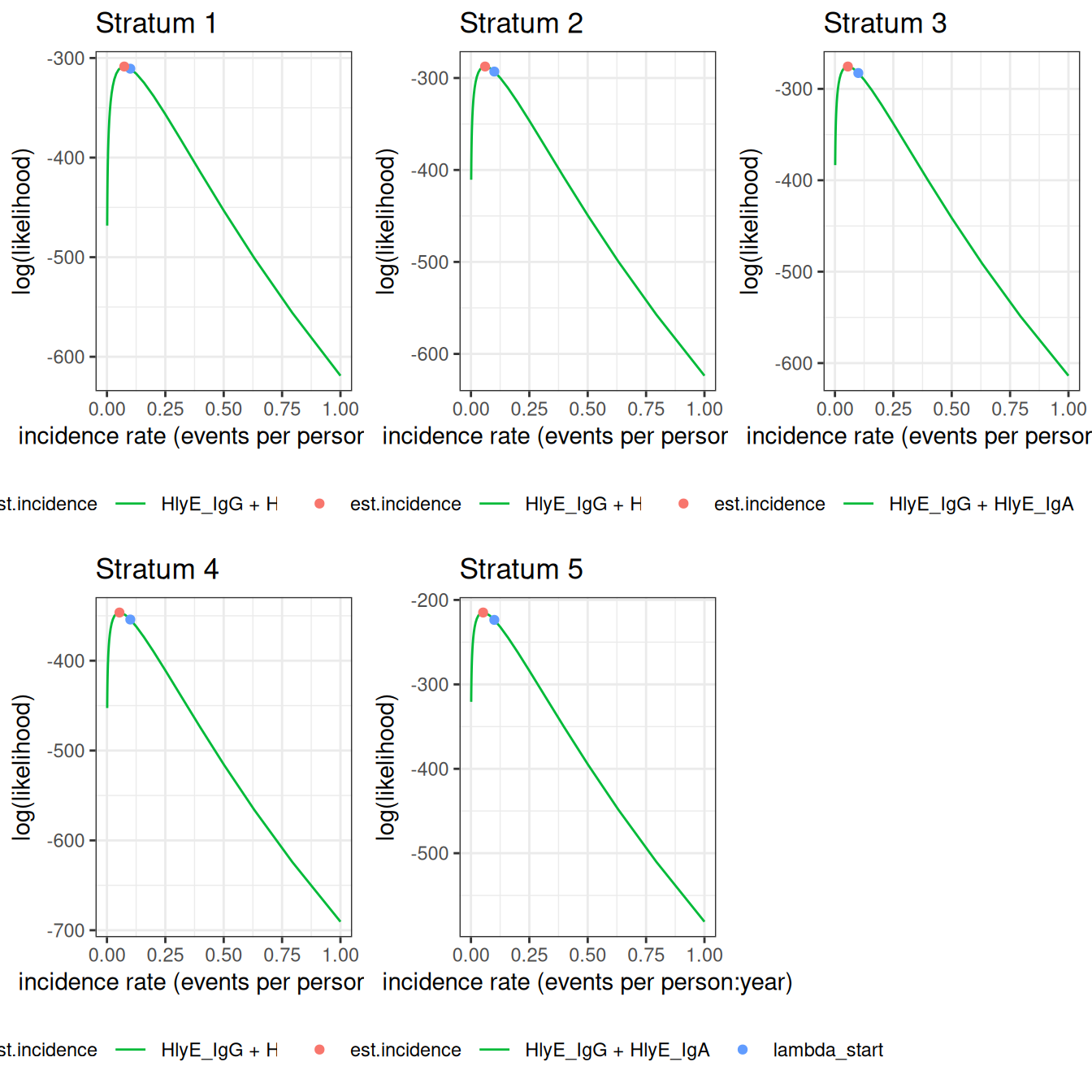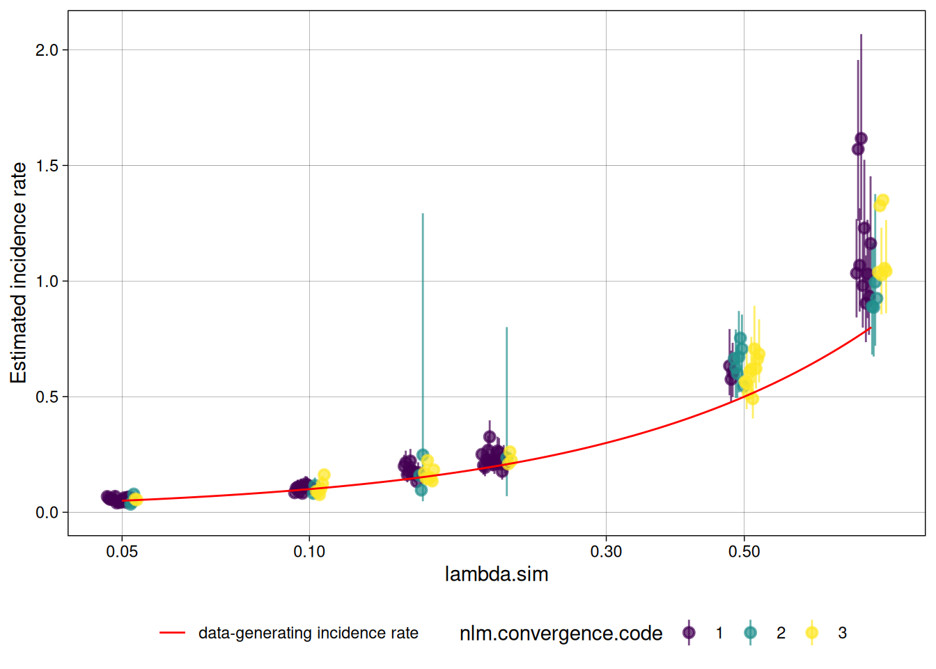 #> Stratum lambda.sim cluster n est.start incidence.rate SE CI.lwr