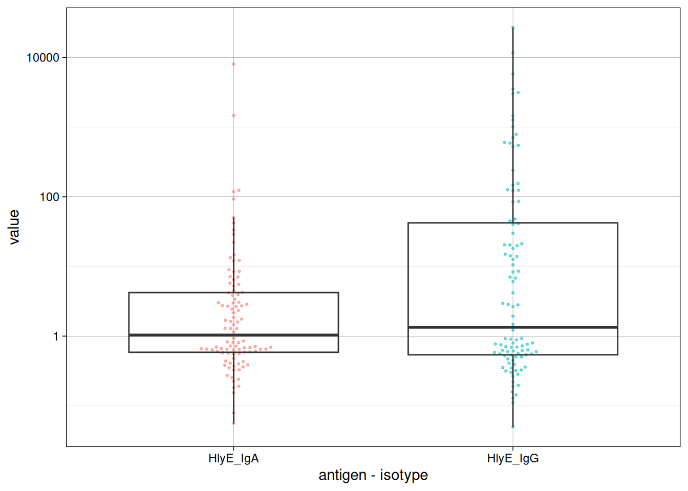 #> a) Antigen isotypes : HlyE_IgG, HlyE_IgA