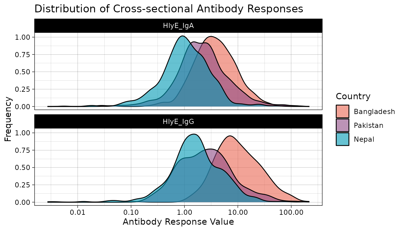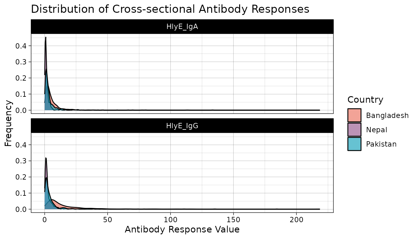 We examine our cross-sectional antibody data by visualizing the distribution of quantitative antibody responses. Here, we will look at the distribution of our selected antigen and isotype pairs, HlyE IgA and HlyE IgG, across participating countries.