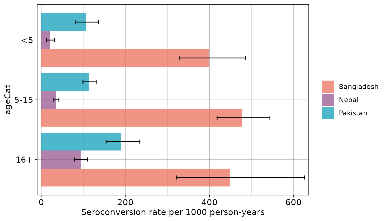 In this plot, we can see that the highest burden is in Bangladesh, but Nepal has the steepest slope and experiences the greatest change in seroconversion rates by age, with lower exposures at younger ages and higher exposures at older ages.