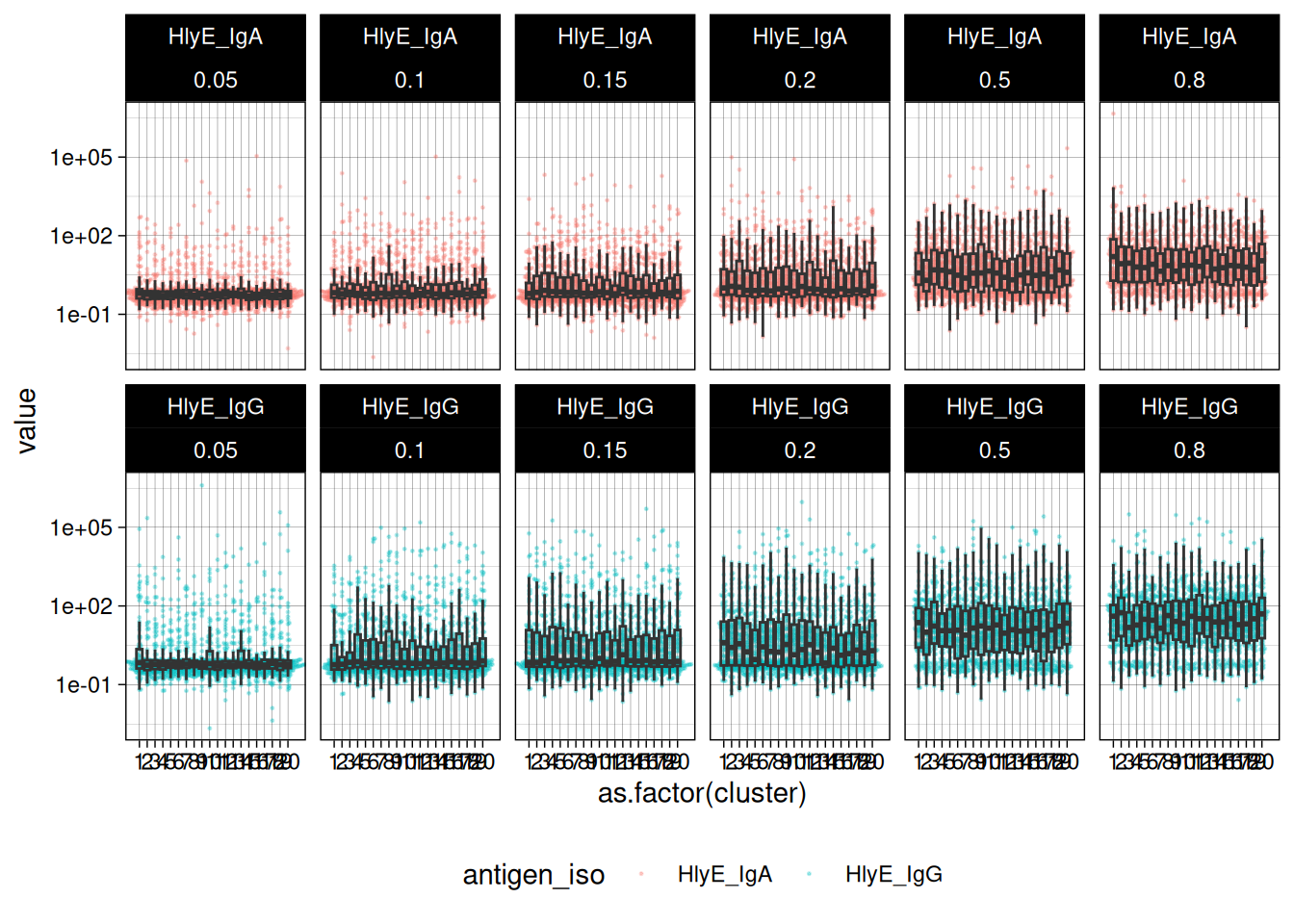 #> a) Antigen isotypes : HlyE_IgG, HlyE_IgA