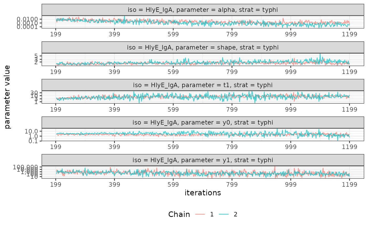 plot_jags_trace() takes a list output from run_mod() to create trace plots for each chain run in the mcmc estimation. Defaults will produce every combination of antigen/antibody, parameters, and stratifications, unless otherwise specified. Antigen/antibody combinations and stratifications will vary by analysis. The antibody dynamic curve includes the following parameters: