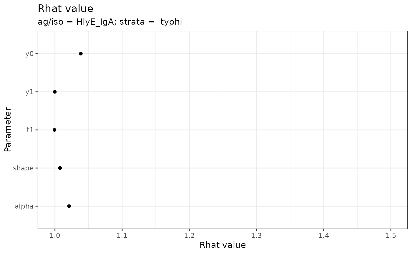 plot_jags_Rhat() takes a list output from run_mod() to produce dotplots of potential scale reduction factors (Rhat) for each chain run in the mcmc estimation. Rhat values analyze the spread of chains compared to pooled values with a goal of observing rhat < 1.10 for convergence. Defaults will produce every combination of antigen/antibody, parameters, and stratifications, unless otherwise specified. Antigen/antibody combinations and stratifications will vary by analysis. The antibody dynamic curve includes the following parameters: